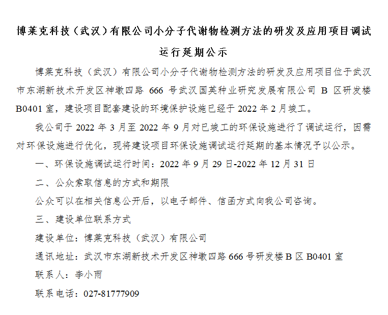 博萊克科技(武漢)有限公司小分子代謝物檢測方法的研發及應用項目調試運行延期公示
