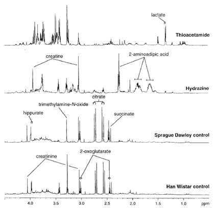 飲酒可以在體內啟動很多基因的表達,但是這并不能解釋醉酒的原因。因此,在很多時候只考慮基因組和蛋白質組變化并不能有效地預測藥物的毒性。但是所有藥物誘導的病理生理紊亂可以導致內源性生化分子物質比例、濃度、結合力和通量失衡。如果失衡的強調足夠大,毒性效應就會影響整個生命體的正常功能。代謝物在體液與細胞和組織內保持動態平衡,當有毒物質或者代謝刺激導致生命體組織內細胞過程異常時,就會影響生物體液的構成比例。在含有多種潛在干擾物的復雜基質中檢測痕量的分析物是所有分析方法都會遇到的難題。因此,在生物樣品中,比如血液、血漿、尿液、膽汁或器官樣品,針對感興趣的特定類型的分析物選擇合適的分析方法至關重要。高分辨率1H-NMR波譜技術用于研究體液成分異常就非常合適,因為它可以不用做樣品分離,不用做預判就可以同時定量多種代謝物。其他技術比如質譜也可以用于產生代謝數據,但是復雜樣品中不同物質離子化效率的差異會影響檢測和定量的準確性。NMR波譜還可以用于有效地篩選組織提取物和細胞懸液的代謝物輪廓異常。同時也有研究已經成功使用高分辨率魔角旋轉1H-NMR波譜技術研究完整組織(intact tissue)的代謝物組成(Moka et al, 1998)。