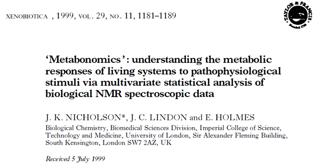 1999年,來自英國帝國理工學院的J.K. Nicholson教授在Xenobiotica雜志上發表了一篇綜述性文章,文章標題是“'Metabonomics': understanding the metabolic responses of living systems to pathophysiological stimuli via multivariate statistical analysis of biological NMR spectroscopic data”,對其實驗室多年來應用磁共振(NMR)方法研究藥物毒性的成果進行總結和展望,首次提出了代謝組學(Metabonomics)的概念。