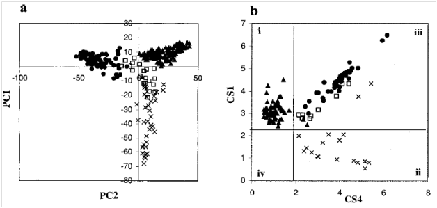 模式識別通常是指在數學上減低多參數維度來進行科學假設和假設檢驗的一種數據分析方法,主成份分析就是其中最簡單的一種。主成份是由多個原始變量經過加權后進行線性組合生成的新的變量。主成份有如下特征:(1)每個主成份之間相互正交;(2)第一主成份包含最多的數據方差信息,其它依次遞減。因此,前兩個或者三個主成份就代表了數據中所含的主要的生化信息的改變,這樣的主成份圖可以用于藥物和毒素在不同器官中根據其毒理學機制聚類分析的可視化(Nicholson and Wilson 1989, Gartlandet al. 1991)。主成份分析不需要提前對樣品進行分組,是一種非監督的分析方法,有時候聚類信息也可能在較小的主成份中體現。使用這種簡單的代謝組學方法我們可以將來自于未知毒性化合物處理后的動物樣品與NMR產生的代謝數據進行比較,進而確定它在模式識別圖中的相似擬合度(Holmeset al. 1998a, b)。