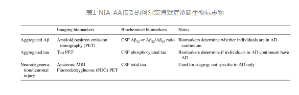 其中,NIA-AA標準承認使用生物標志物作為診斷手段的潛力,該標準認可的阿爾茨海默癥診斷生物標志物包括成像和生化生物標志物,可分為三類:聚集的β-淀粉樣蛋白(Aβ)、聚集的tau(神經纖維纏結)以及神經退行/神經元損傷(表1)。