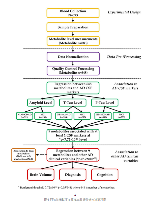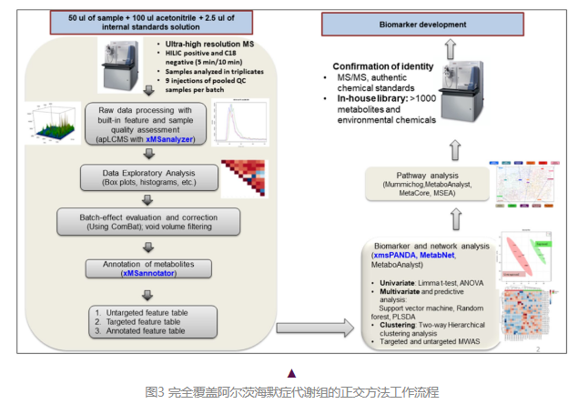 很顯然,患者的腦組織不是生物標志物篩選的可行樣本來源;因此,早期研究使用死后的腦組織作為阿爾茨海默癥生物標志物來源;現在,研究者們開始轉向關注循環體液中的潛在樣本對象。質譜(MS)是一種強大的、無標簽的技術,可用于代謝物的鑒定和定量。該篇綜述討論了基于質譜(MS)的阿爾茨海默癥代謝組學研究,包括樣品類型和制備、質譜數據采集策略和數據分析以及從研究中獲得的生物學見解,希望為未來的阿爾茨海默癥代謝組學研究提供參考。