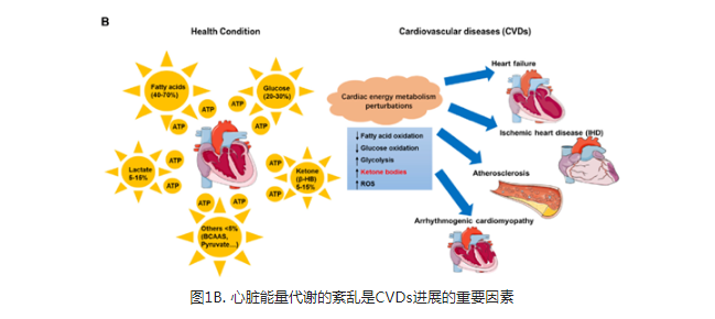 研究表明,心血管疾病的進(jìn)展與心肌細(xì)胞代謝靈活性的喪失有關(guān)。能量缺乏在心肌細(xì)胞中很常見,這種代謝改變?nèi)Q于疾病病理生理進(jìn)展階段。即使在早期階段,結(jié)構(gòu)性心臟病也會發(fā)生能量底物利用從脂肪酸轉(zhuǎn)換為葡萄糖的情況。此外,能量底物利用的改變在心力衰竭(HF)的進(jìn)展中也起著關(guān)鍵作用。有趣的是,在脂肪酸氧化減少的情況下,衰竭的心臟似乎對代謝進(jìn)行了重新編程,以增加對酮體作為燃料來源的依賴。在病理重塑心臟(如高血壓或心肌梗死)和糖尿病心臟中,酮代謝過程中消耗的用于ATP生成的O2比FAO17更有效。與FAO相比,酮體氧化的能量效率更高,每投入一個氧分子(磷氧比)將產(chǎn)生更多的ATP用以供能。此外,研究報道心律失常性心肌病患者的血漿中β-HB增加,同時心臟對酮體的利用率增加。在動物模型中,研究表明:在衰竭的小鼠心臟中,脂肪酸利用率下調(diào),酮體利用率上調(diào)。因此,推測CVDs中心臟酮體代謝的增強(qiáng)是不良環(huán)境中心肌細(xì)胞ATP生成的有效替代途徑。