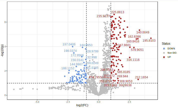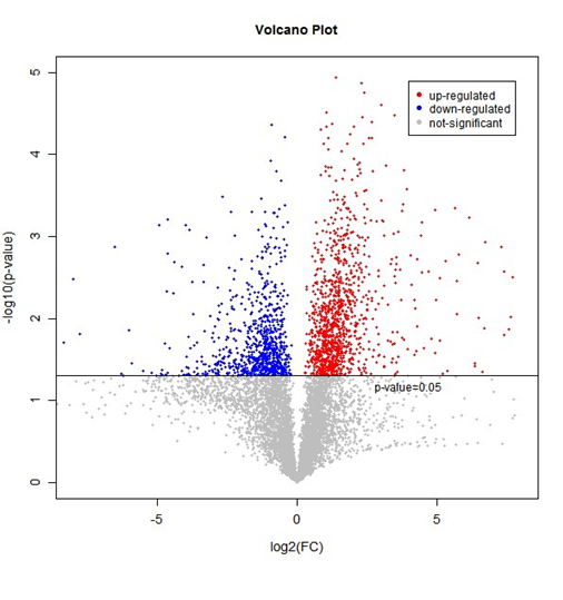 圖中每個點代表一個檢測到的靶標。橫軸是Log2(fold change),點越偏離中心,表示差異倍數越大。縱軸是-Log 10 ( P-value),點越靠圖的頂部表示差異越顯著。點的顏色標記其對應的靶標是上調, 下調還是無差異。P值<0.05且FC>2的表現為紅色點,說明該靶標上調,P值< 0.05且FC < 2的表現為藍色點,說明該靶標下調。