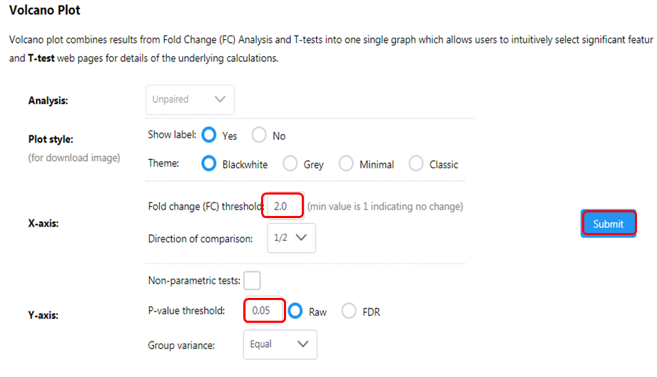 1)填寫FC閾值,一般為2。P-value閾值一般為0.05。也可根據自己實際情況調整。