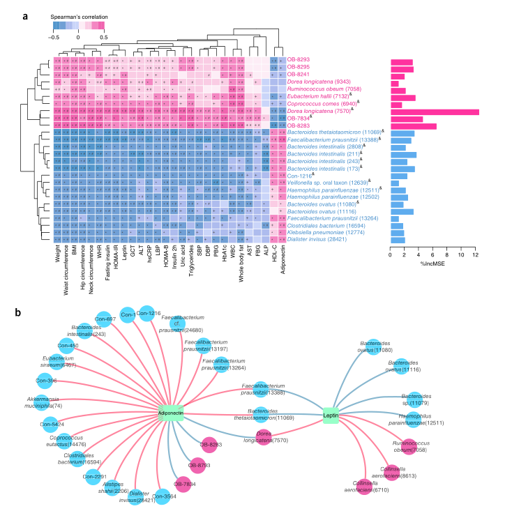 瘦素和脂聯素是兩種脂肪細胞衍生的激素,腸道微生物群定植后循環瘦素濃度增加。結果發現,普氏擬青霉和擬青霉微粒與循環瘦素濃度呈負相關,與循環脂聯素濃度呈正相關。D. longicatena與循環瘦素濃度呈正相關,與循環脂聯素濃度呈負相關(隨機森林回歸和Spearman相關值<-0.3或>0.3;圖2b),表明這些物種可能構成連接腸道微生物群和代謝狀態的潛在生物標記物。