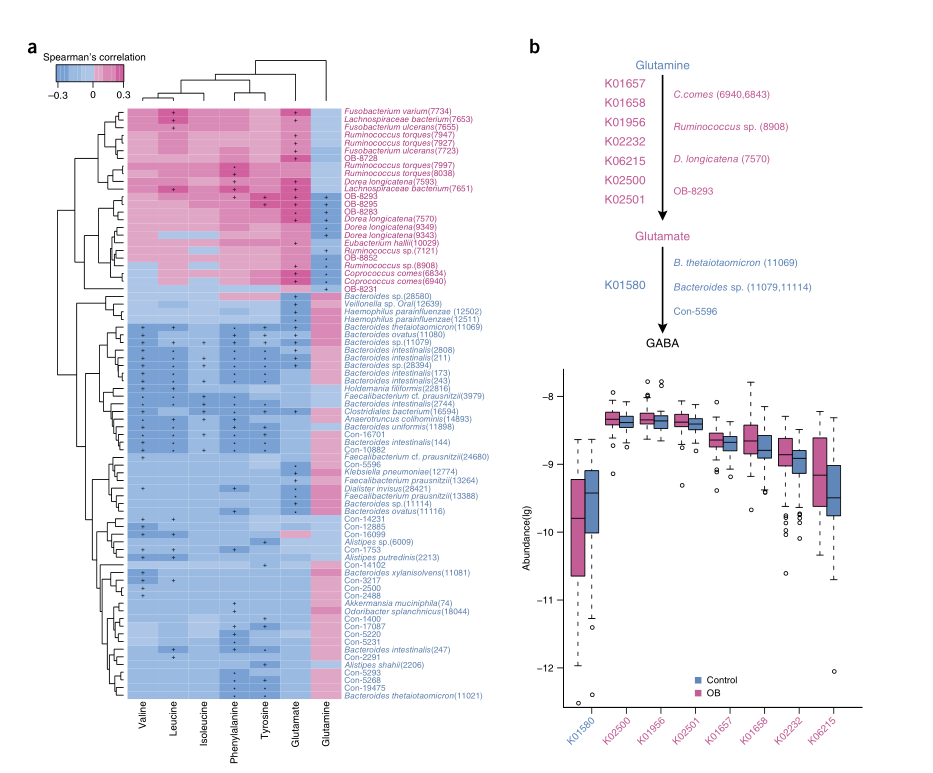 在檢測到的氨基酸中,與瘦對照組相比,谷氨酸在肥胖個體中表現出最顯著的增加。谷氨酸與16種富含肥胖的MLG呈正相關,與18種含有編碼谷氨酸代謝相關酶的基因的對照富含MLG呈負相關(圖3a)。值得注意的是,富含肥胖癥的瘤胃球菌(obesitynriched ruminocococus sp.)、D. longicatena和C.comes以及OB-8293,它們擁有編碼從谷氨酰胺中產生谷氨酸所需酶的基因(圖3b),與循環谷氨酸水平正相關,與谷氨酰胺水平負相關。這些觀察結果提示循環中谷氨酸和谷氨酰胺的水平可能反映了這些細菌種類豐度的變化。