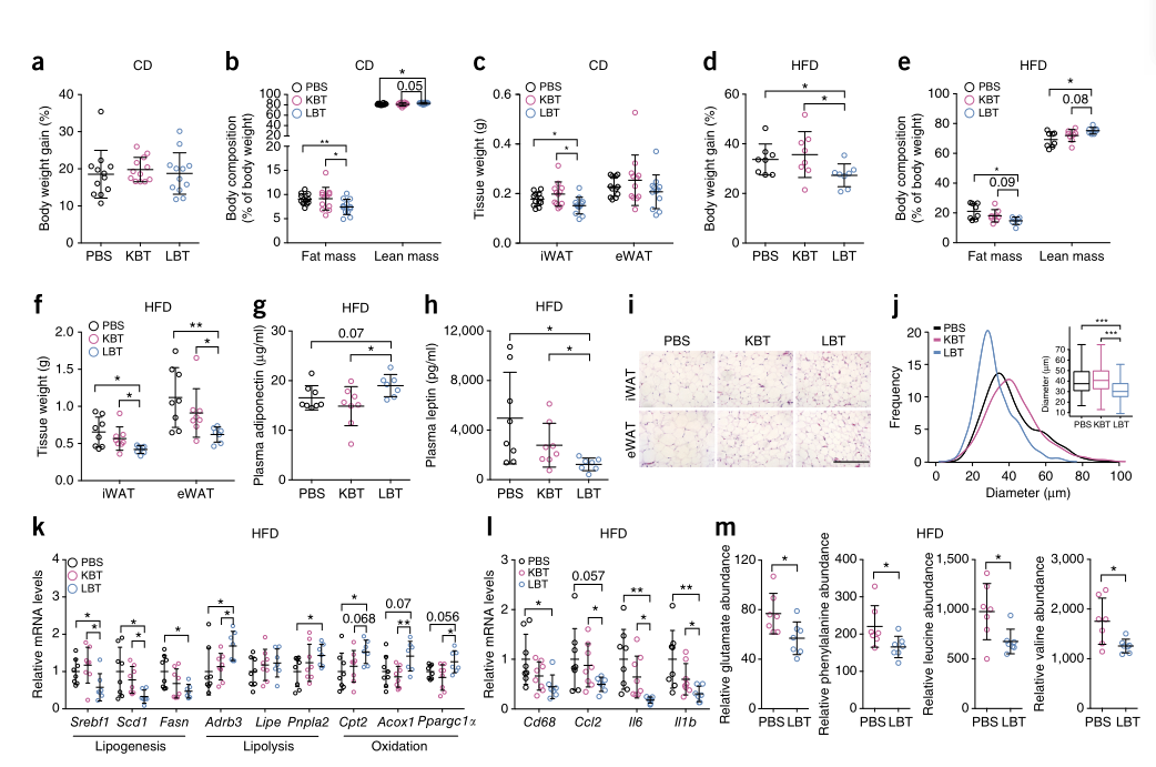 多形擬桿菌是人類腸道中的優勢菌群,它的消耗和肥胖以及血清中的氨基酸濃度相關。基于此,我們研究了腸道中的多形擬桿菌與宿主肥胖之間的可能因果關系。使用未經熱處理的活的多形擬桿菌灌胃,顯著降低常規飼養小鼠的總體和腹股溝脂肪量并增加了瘦組的體重(圖4a-c)。進一步,該措施會減輕高脂肪飲食喂養的小鼠的體重的增加和肥胖(圖4d-f)。與用磷酸鹽緩沖鹽水(PBS)或熱滅活多形擬桿菌灌胃的HFD小鼠相比,用活多形擬桿菌灌胃的HFD小鼠的脂聯素血漿濃度較高,而瘦素血漿濃度較低(圖4g、h)。曾經關于白色脂肪組織的研究表明,給予活的多形擬桿菌比給予PBS(磷酸緩沖鹽水)和未經熱處理的活的多形擬桿菌的脂肪細胞更小(圖4i,j)。此外,與脂肪生成有關的編碼蛋白質的基因(包括Srebf1、Scd1和Fasn)的mRNA水平在灌胃活多形擬桿菌的高脂肪飲食喂養的小鼠的白色脂肪組織中較低,而與脂肪分解和脂肪酸氧化有關的基因(包括Adrb3、Pnpla2、Cpt2、Acox1和Ppargc1a)的表達較高(圖4k)。高脂肪飲食喂養的小鼠脂肪組織中炎癥標記物Cd68、Ccl2、Il6和Il1b的表達因灌胃活的多形擬桿菌而減弱,表明炎癥狀態有所改善(圖4l)。然而,我們觀察到三組的空腹血糖或胰島素濃度及脂肪組織中磷酸化AKT水平沒有顯著差異。喂飼多形擬桿菌對食物攝入和24小時糞便熱量含量均無影響)。值得注意的是,我們檢測到,與用PBS灌胃的高脂肪飲食喂養的小鼠相比,用活的多形擬桿菌灌胃的HFD小鼠的循環氨基酸豐度較低,包括谷氨酸、苯丙氨酸、亮氨酸和纈氨酸(圖4m)。值得注意的是,有報道稱谷氨酸可誘導脂肪分解減少和脂肪細胞增大從而引起肥胖。
