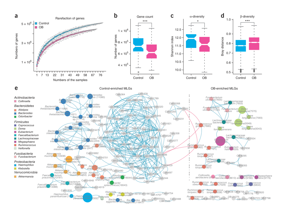 我們對257個糞便樣本進行了鳥槍定序法分析(第一隊列中來自72個肥胖個體和79個瘦對照的151個樣本,第二隊列中來自23個肥胖個體和26個對照的49個樣本,以及來自23個肥胖個體的63個樣本,包括6個接受sg的病例組)。我們發現這些年輕、肥胖的個體的基因計數和細菌多樣性低于對照組(圖1a-c),表明肥胖方面的基因豐富度較低而與種族或年齡無關。還觀察到肥胖微生物組的β多樣性較高,表明肥胖個體的群落結構比瘦對照組更為異質(圖1d)。使用宏基因組關聯分析,使用全基因組關聯分析,我們確定了350524個與肥胖相關的基因(P<0.01,Wilcoxon秩-總和測試,FDR=0.047)。關聯分析也顯示P肥胖相關基因顯著富集的價值分布具有低P值的標記,表明這些基因與肥胖有關。我們確定了一個由MLG組成的細菌群落,多形擬桿菌、單形、卵形類桿菌、類桿菌,在瘦的對照組中顯著富集(圖1e)。