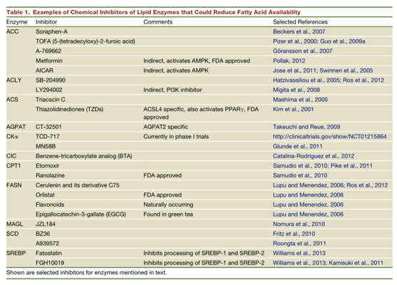癌細胞依賴脂肪酸作為細胞基本構件,用于膜形成、能量儲存和信號分子的產生。如果癌細胞增殖需要脂肪酸的模型是正確的,那么癌細胞可能在脂肪酸代謝途徑中存在多個靶點,可以破壞癌細胞快速增殖,而這些靶點已經存對應的抑制劑(表1)。就像葡萄糖代謝一樣,針對脂肪酸代謝可能對高增殖細胞更具選擇性;蛘,以細胞特異性和靶向性的方式來遞送脂肪酸代謝抑制劑也是潛在治療方式。