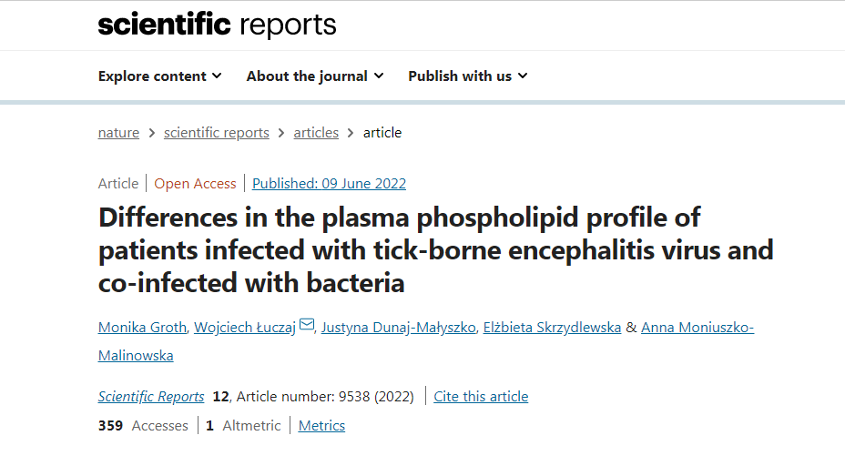 蜱傳腦炎(TBE)是一種具有傳染性的病毒性疾病,其發病機制尚不完全清楚。TBE也可與多種細菌合并感染,這也為準確診斷和治療增加了很大難度。波蘭拜亞斯托克醫科大學傳染病和神經感染系、比亞韋斯托克醫科大學分析化學系Monika Groth和WojciechŁuczaj等人于2022年6月在Nature子刊Scientifc Reports發表的題為“Differences in the plasma phospholipid profile of patients infected with tick-borne encephalitisvirus and co-infected with bacteria”的文章,通過色譜質譜檢測技術分析健康對照組、蜱傳腦炎病毒感染與細菌共感染患者的血漿磷脂譜(PL)和神經酰胺譜(CER),結果可以區分TBE的致病機制和細菌共感染,從而為改進診斷過程,針對性的藥物治療提供了參考。原文鏈接:https://doi.org/10.1038/s41598-022-13765-2