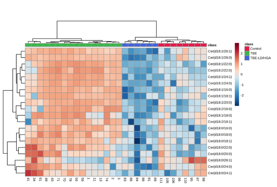 與對照組相比,兩組患者(TBE和TBE+LD/LGA)血漿中CER種類的變化方向相反。幾乎所有的CER在TBE患者血漿中均上調,而在TBE+LD患者中觀察到這些CER的相對含量總體呈下降趨勢。在所有相關的CER中,CER (d18:0/26:1)在TBE患者血漿中顯著下調。