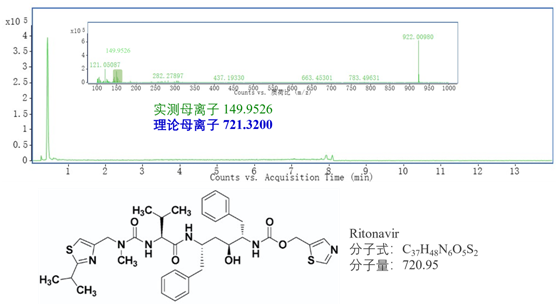 圖2是實測樣本中Ritonavir(利托那韋)片劑的色譜圖和質譜圖,未檢測出有效成分。