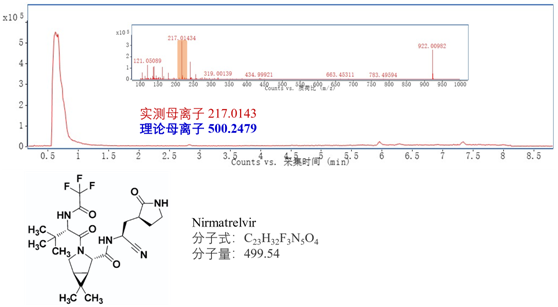 圖1是實測樣本中Nirmatrelvir(奈瑪特韋)片劑的色譜圖和質譜圖,未檢測出有效成分。