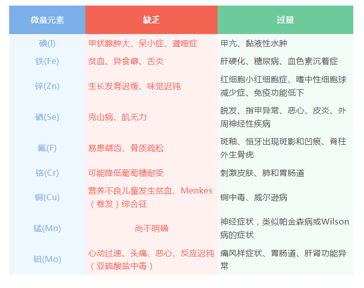 所有微量元素的攝入量過高都有毒性作用,其中一些(砷、鎳和鉻)可能是致癌物質。正常飲食的成年人中不易自然發生微量元素缺乏(碘、鐵、鋅除外);嬰幼兒由于生長迅速且攝入量差異較大,因而更容易患病。