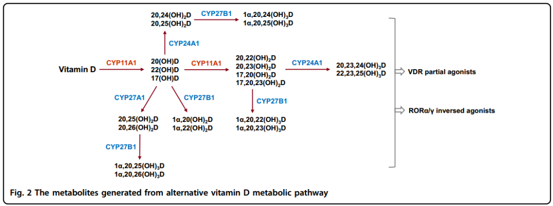 在皮膚細胞中,CYP11A1驅動維生素D的替代代謝路徑,CYP24A1能產生抑制維生素D代謝的產物而不是降解骨化三醇。有趣的是,CYP11A1產生的20(OH)D可以被CYP24A1羥化后形成20,24(OH)2D和20,25(OH)2D,這兩種二氫化物與骨化三醇和20(OH)D對黑色素瘤有更好的抑制效果。與此相一致的是,20-羥化維生素D代謝物受體RORα/γ的表達與黑色素瘤的進展呈負相關并且有良好的預后。這些研究表明,激活維生素D的替代代謝路徑可能是腫瘤治療的一個新策略。