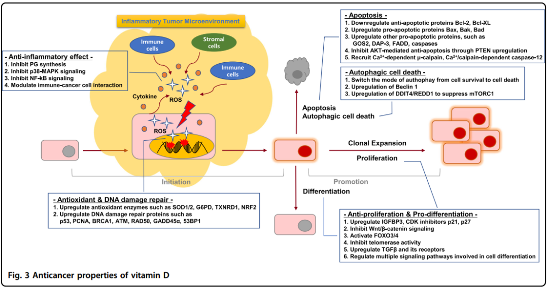 腫瘤的初始階段是一個在正常細胞中不可逆的基因突變過程,隨后誘導了變化。很多數據表明維生素D在腫瘤形成階段起到關鍵的阻礙作用,這種作用通過抗炎、抗氧化以及DNA損傷修復過程得以發揮。