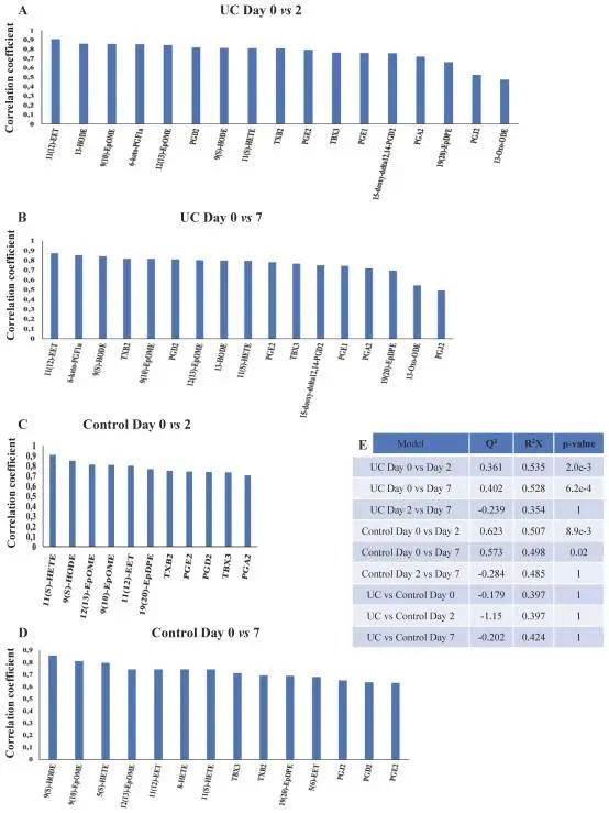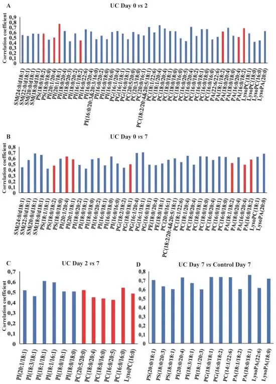 共檢測并鑒定了98種磷脂。經(jīng)過統(tǒng)計學(xué)分析,發(fā)現(xiàn)UC組中與第0天相比,第2天和第7天所有檢測的磷脂類別存在顯著差異,而在對照組中第0天和第7天之間沒有顯著差異。共檢測和鑒定了33種類花生酸。發(fā)現(xiàn)與第0天相比,每組在第2天和第7天都顯著降低,其中一些是UC特有的,如PGE1、13,14-2OH-15keto-PGD2、PGJ2、5(S)-HEPE、13-HODE和14,15-di-HETE,而其他代謝物對對照是特異的,如5(S)-HETE、8-HETE和5(6)-EET,但在三個時間點比較UC和對照組時,沒有發(fā)現(xiàn)差異。