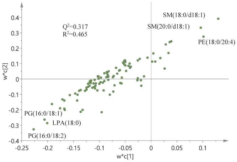 最后,基于OPLS-DA模型,對傷口評分(x -矩陣)與磷脂(y -矩陣)進行相關(guān)性分析,創(chuàng)面評分與磷脂譜高度相關(guān),特別是與鞘磷脂(SM)和磷脂酰乙醇胺(PE)的變化,它們與創(chuàng)面評分呈正相關(guān),而PG和LPA水平呈負相關(guān)。