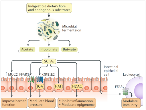 腸道遠端的菌群發酵過程通常會產生短鏈脂肪酸,短鏈脂肪酸是結腸上皮細胞的主要營養來源。這些脂肪酸通常含有1-6個碳,是結腸發酵的重要終產物,主要來自膳食纖維、抗性淀粉和上消化道未消化的糖和蛋白質等營養素。結腸中產生的絕大多數短鏈脂肪酸是乙酸、丙酸和丁酸,比例大概分別為60%、20%和20%。大多數產生的短鏈脂肪酸被腸道吸收。吸收的短鏈脂肪酸可以通過與特定的宿主受體結合來影響高血壓的發展。