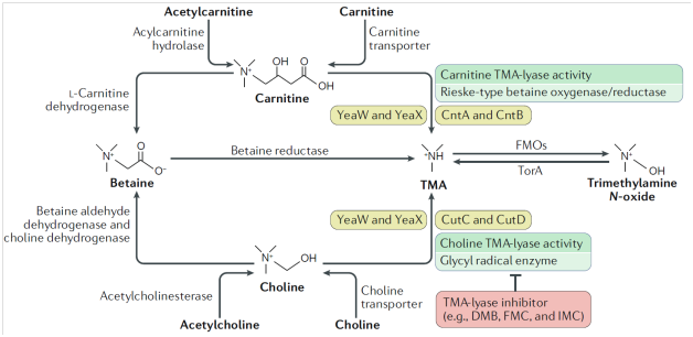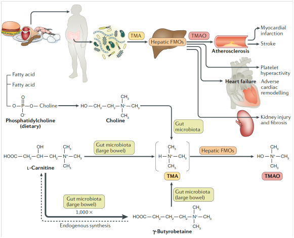 TMA-TMAO途徑是飲食、腸道菌群與動脈粥樣硬化和血栓形成危險因素的一個新的交匯點。TMAO由含有TMA基團的食物,如磷脂酰膽堿、膽堿和肉堿等產生。這些營養物質通過多種微生物酶代謝產生TMA,TMA在肝臟中主要由FMO3代謝產生TMAO。