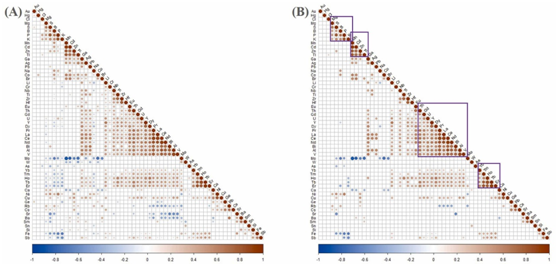 圖3. 58種元素之間的相關性。正相關用紅點表示,負相關用藍點表示,點的權重代表相關系數的值。(A) 相關系數顯示為彩色點,p < 0.05。(B) 相關系數顯示為彩色點,p < 0.001。