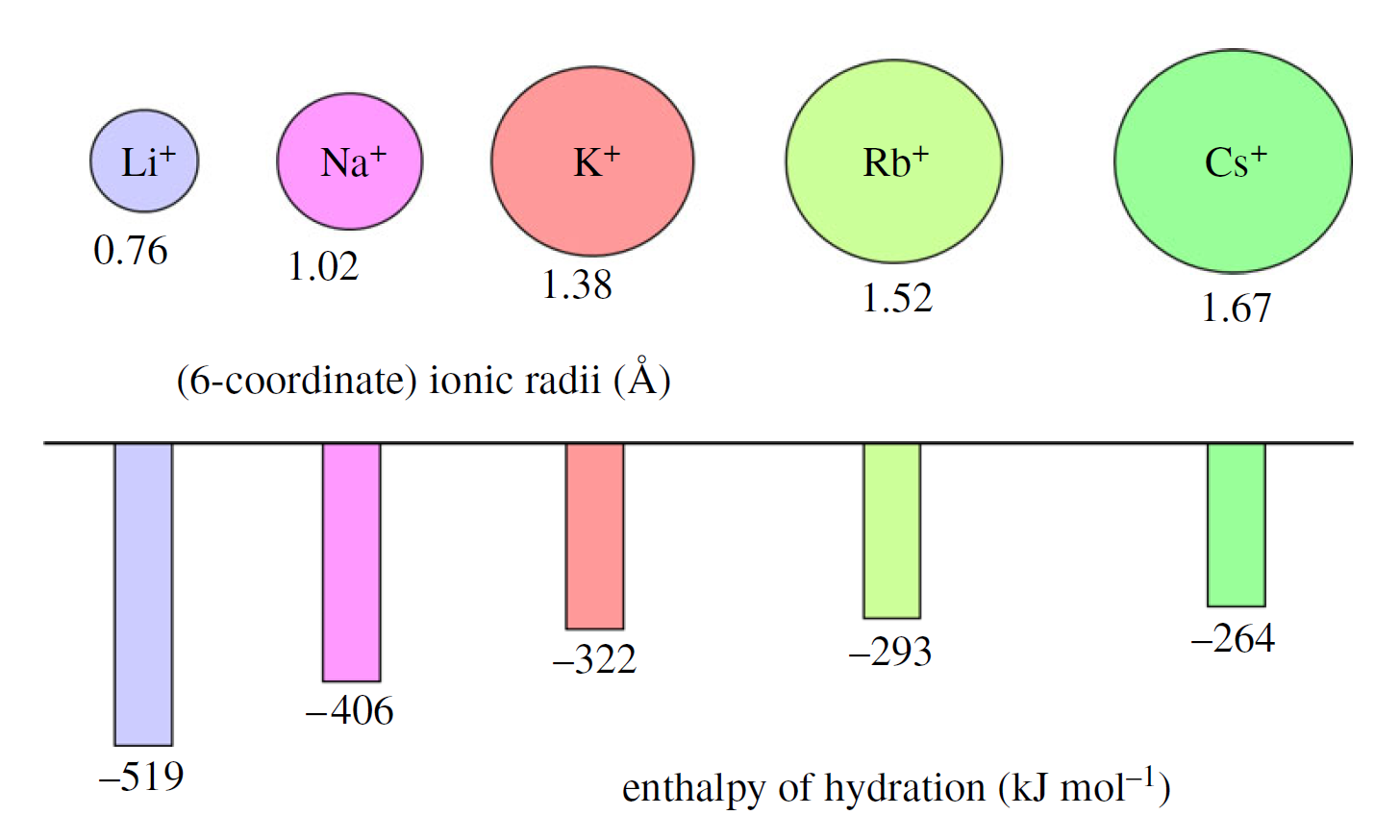 (Li, Z = 3)不是必需元素,但是在某些自然界中的水里以Li+的形式存在,尤其是溫泉水和一些商業瓶裝礦泉水。人體內有約2.4 mg Li,也許低劑量的鋰對人體有益。在醫藥領域,鋰鹽被廣泛用于治療雙向情感障礙。Li+是一個非常小的離子(離子半徑0.76 Å),具有較高的水化熵(−519 kJ mol−1)。