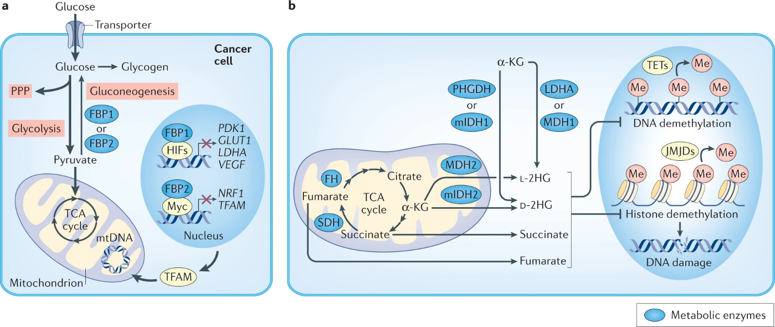 草酰乙酸、琥珀酸、富馬酸和2-羥基戊二酸:美國西北大學范伯格醫學院Navdeep S. Chandel團隊2021年10月于Nature Reviews Cancer上發表了題為“Cancer metabolism: looking forward”的綜述(DOI: 10.1038/s41568-021-00378-6),概述了腫瘤代謝領域的最新研究進展。在過去十年,TCA循環再次成為支持腫瘤生長的關鍵合成代謝中心。丙酮酸羧化酶(PC)催化丙酮酸產生TCA循環代謝物草酰乙酸,已被證明是原發和轉移性腫瘤生長所必需的。此外,從草酰乙酸生成的天冬氨酸及其衍生物天冬酰胺都可以限制腫瘤的生長。在特定的腫瘤中,編碼琥珀酸脫氫酶(SDH)、富馬酸水合酶(FH)以及異檸檬酸脫氫酶1或2(IDH1或IDH2)的基因發生功能缺失突變,會造成腫瘤中代謝產物琥珀酸、富馬酸和2-羥基戊二酸(2HG)的濃度增加,這些代謝物是導致不同癌癥的誘因,因此被稱為“腫瘤代謝物”。這三種腫瘤代謝物中任何一種的積累已被證明有助于惡性腫瘤的發展,但僅限于某些組織。原因是這些代謝物與α-酮戊二酸(α-KG)結構相似從而競爭性抑制α-KG依賴的雙加氧酶(α-KGDDs)包括組蛋白去甲基酶、RNA去甲基酶等從而調節表觀遺傳修飾,影響基因表達。