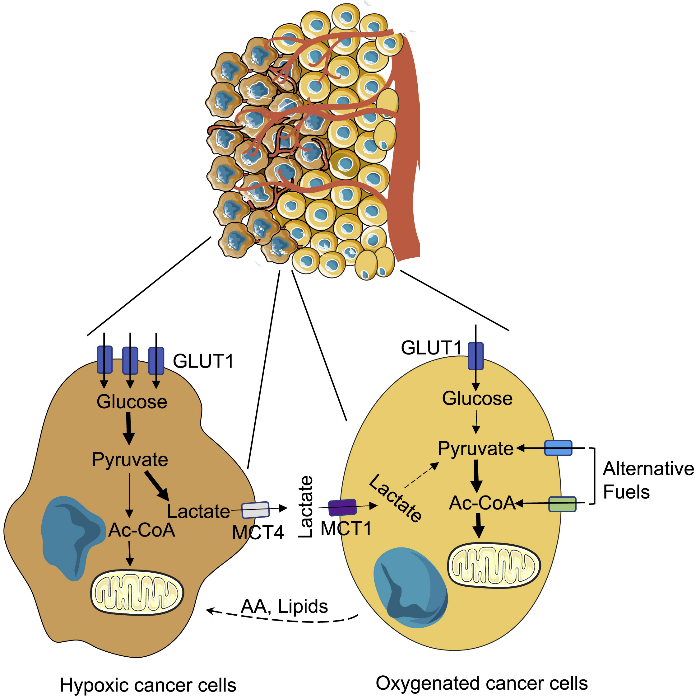 乳酸:賓夕法尼亞大學M. Celeste Simon團隊2020年6月在Developmental Cell上發表了題為“Cancer Cells Don’t Live Alone: Metabolic Communication within Tumor Microenvironments”的綜述(DOI: 10.1016/j.devcel.2020.06.018),概述了原發和轉移性TME中腫瘤細胞和不同間質成分之間代謝通信的最新進展。在非小細胞肺癌中,曾被認為是代謝廢物的乳酸比葡萄糖更適合作為TCA循環的底物。在這種情況下,乳酸和葡萄糖是并行利用的,因為乳酸可以通過線粒體LDH活性直接進入TCA循環。通過LDHA的乳酸代謝也可能影響胞質氧化還原狀態,并將葡萄糖重定向到戊糖磷酸途徑和己糖胺的生物合成。乳酸作為一種信號分子,可能會改變細胞內的信號通路和/或基因表達,從而影響葡萄糖的攝取和分解代謝。腫瘤腔內的癌細胞相互協作,形成代謝“共生”,乳酸穿梭是一個例子,在缺氧區域的癌細胞通過厭氧糖酵解消耗葡萄糖并釋放乳酸,然后乳酸被鄰近富氧腫瘤區域的癌細胞用作TCA循環的底物。抗血管生成治療引起的急性缺氧促使胰腺神經內分泌和乳腺癌細胞產生過量乳酸,然后被血管附近的癌細胞利用。類似的代謝“共生”在肺癌和結腸癌中也存在。乳酸穿梭可能是單羧酸轉運體(MCTs)差異表達的結果:缺氧的癌細胞表達高水平的MCT4,作為乳酸主要的輸出轉運蛋白,而富氧區域的癌細胞表達MCT1作為乳酸輸入轉運蛋白。目前尚不清楚低氧區域腫瘤來源的乳酸在多大程度上對氧化代謝有貢獻,因為氧氣充足的癌細胞可以很容易地代謝葡萄糖和包括乳酸在內的其他循環營養物質。