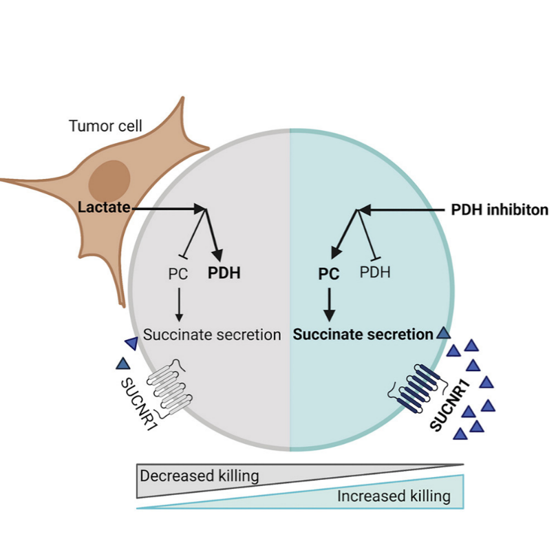 丙酮酸和琥珀酸:哈佛醫學院的Marcia C. Haigis課題組和Arlene H. Sharpe課題組于2022年8月在Cell Metabolism雜志上發表了題為“Tumor cells dictate anti-tumor immune responses by altering pyruvate utilization and succinate signaling in CD8+ T cells”的文章(DOI: 10.1016/j.cmet.2022.06.008),發現腫瘤來源的乳酸改變了T細胞的代謝,導致CD8+T細胞中丙酮酸羧化酶(PC)活性降低,抑制了T細胞的細胞毒性。乳酸也改變了丙酮酸進入TCA循環的途徑,從PC重定向到丙酮酸脫氫酶(PDH)。PDH的抑制增加了PC活性和琥珀酸分泌,從而激活琥珀酸分泌和琥珀酸受體1(SUCNR1),增強T細胞的抗腫瘤細胞作用。