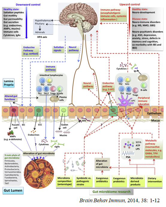 2018年,Shan Liang等人發(fā)表的研究詳細闡述了腸道菌群在MDD發(fā)病中的作用,并得出以下結(jié)論:由于遺傳或外界因素導(dǎo)致的腸道菌群紊亂,在其代謝產(chǎn)物的作用下,導(dǎo)致腸道中5-羥色胺和多巴胺的釋放和作用減少,阻礙腦源性神經(jīng)營養(yǎng)因子(BDNF)的合成,進而導(dǎo)致或加重抑郁癥(Shan et al, 2018);Yu Du等人在《Heliyon》發(fā)表研究,闡明了腸道菌群紊亂通過單胺類神經(jīng)遞質(zhì)釋放和功效的調(diào)節(jié)、下丘腦-垂體-腎上腺(HPA)軸活性和功能的改變以及BDNF表達的調(diào)節(jié)影響MDD的發(fā)生,表明“微生物-腸-腦”軸在抑郁癥發(fā)生中的重要作用(Yu et al, 2020)。