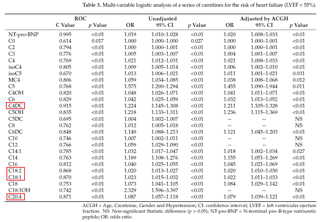 將HF與對照組進行比較,發現4種脂酰肉堿C4DC(AUC = 0.915,p < 0.01)、C20:4(AUC = 0.871,p < 0.01)、C18:1(AUC = 0.870,p < 0.01)和 C18:2 具有顯著值 (AUC = 0.868,p < 0.01),并且發現年齡、性別、高血壓和血清肌酐獨立地增加了心力衰竭的診斷。評估了每種肉堿對HF診斷的獨立影響,同時根據上述因素調整,證明了這4種肉堿可以獨立驗證心力衰竭診斷,如表 3 所示。