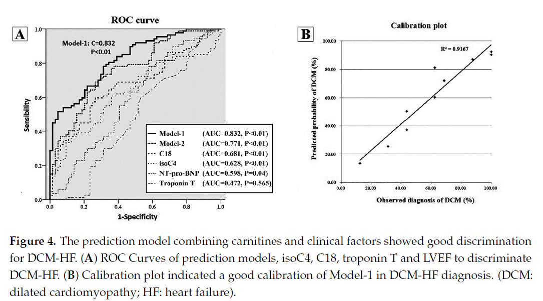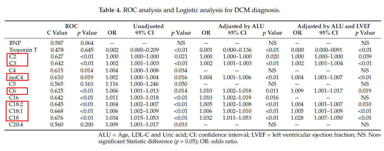 進一步地,即使調整年齡、LDL-C、血尿酸和 LVEF,發現7種脂酰肉堿能診斷DCM-HF,這7種脂酰肉堿是C2、C3、isoC4、C6、C18、C18:1和C18:2,如表4所示。