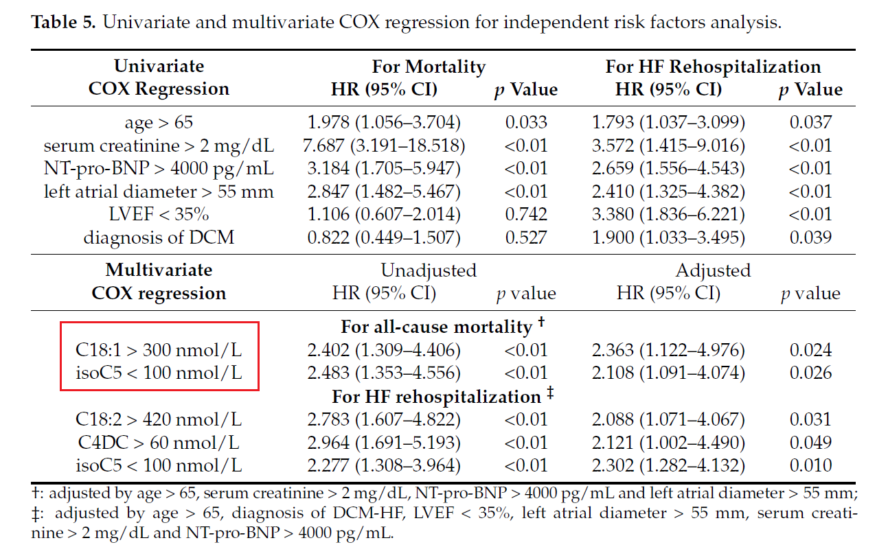 對全因死亡率的分析發現,除了年齡(> 65歲)、血肌酐(> 2 mg/dL)、NT-pro-BNP(> 4000 pg/mL)、左心房直徑(> 55 mm)這些高危因素外,C18:1和isoC5也會增加全因死亡率,如表5所示。