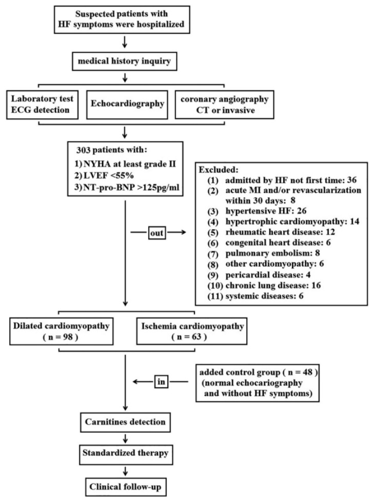 篩選入組的志愿者共有209名,其中非缺血性擴張型心衰(DCM-HF)病人98名,缺血型心衰(IHD-HF)病人63名,健康對照組48名。對這三組志愿者的血清定量檢測脂酰肉堿水平。