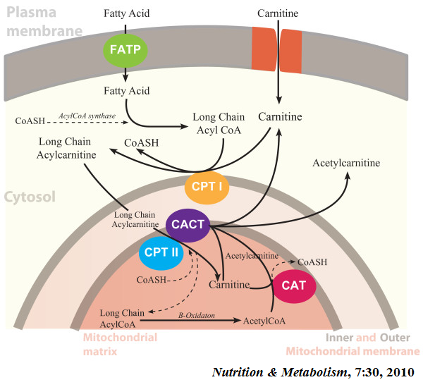 肉堿穿梭和脂肪酸氧化:由于脂肪酸活化成脂酰CoA發生在胞液中,而脂肪酸氧化發生在線粒體基質內,中短鏈脂酰CoA可以滲透通過線粒體內膜,而長鏈脂酰CoA不能通過,需要一個特殊的運輸機制-肉堿穿羧系統(Carnitine shuttle system)。肉堿脂酰轉移酶I(CPT I)位于線粒體外膜上,使得脂酰CoA(Acyl-CoAs)變成了脂酰肉堿(Acylcarnitines);位于線粒體內膜上的肉堿-脂酰肉堿轉移酶(CACT)將脂酰肉堿順利轉運至線粒體基質中;脂酰肉堿一旦進入到線粒體基質,就在肉堿脂酰轉移酶II(CPT II)作用下釋放出游離肉堿,形成的脂酰CoA進行脂肪酸β氧化變成乙酰CoA;游離的肉堿一部分可以通過CACT轉移到線粒體外,一部分還可以和乙酰CoA在肉堿轉移酶(CAT)作用下生成CoA和乙酰肉堿,乙酰肉堿也可以通過CACT轉移到線粒體外。