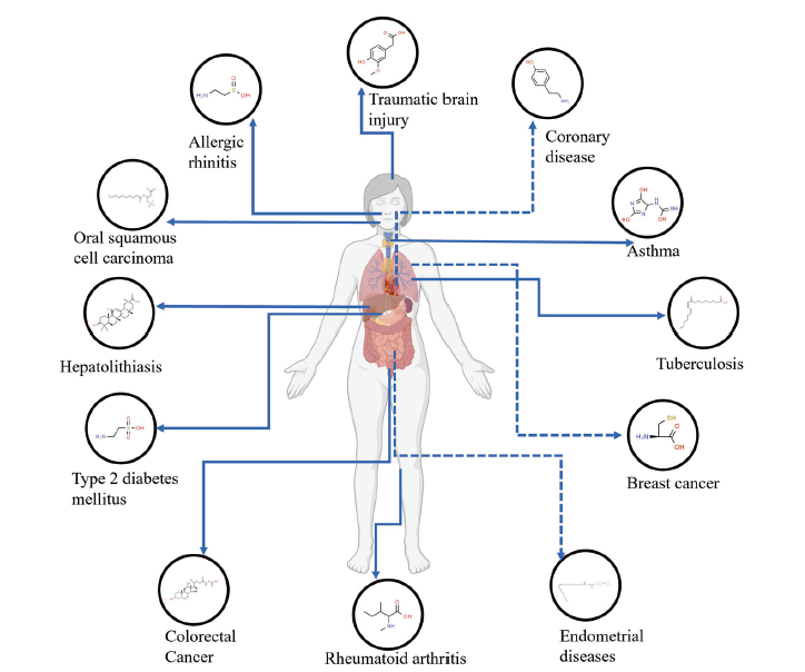 近年來,人們發現了多種生物標志物用于早期疾病發現和預測疾病進展、臨床結局或藥物反應。生物標志物可以是一組代謝物、一種代謝物或者一種分子特征。疾病的出現表明代謝物濃度的異常是系統代謝通路穩態受到破壞的一種征兆。因此,與蛋白質和基因不同,代謝物作為生化活性特征與人類表型密切相關。