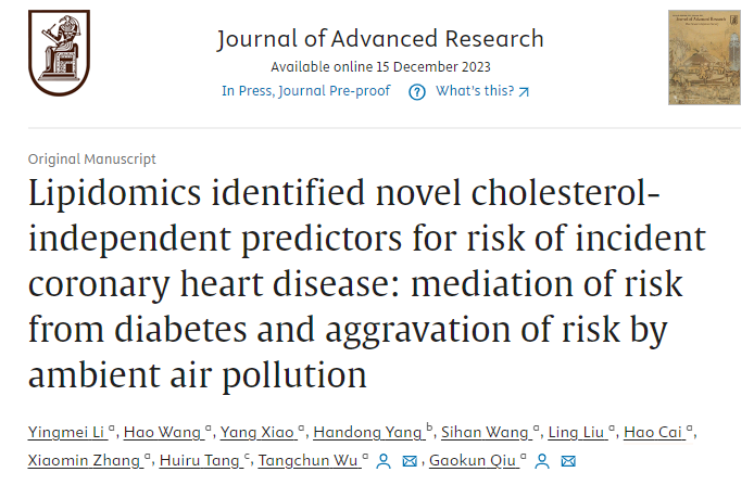 前期的脂質組學研究發現了多種脂質可作為心血管風險的預測因子,但是預測性能和通量有限。華中科技大學同濟醫學院公共衛生學院邱高坤團隊、鄔堂春團隊和復旦大學人類表型組研究院唐惠儒團隊合作,于2023年在Journal of Advanced Research期刊上發表題為“Lipidomics identified novel cholesterol-independent predictors for risk of incident coronary heart disease: mediation of risk from diabetes and aggravation of risk by ambient air pollution”的研究論文,使用前瞻性巢式隊列研究,發現血漿中7種脂質的組合可以作為CHD(冠心病)預測因子,還發現了糖尿病或重度空氣污染暴露個體中 CHD 風險分層的新生物標志物。原文鏈接:https://doi.org/10.1016/j.jare.2023.12.009。