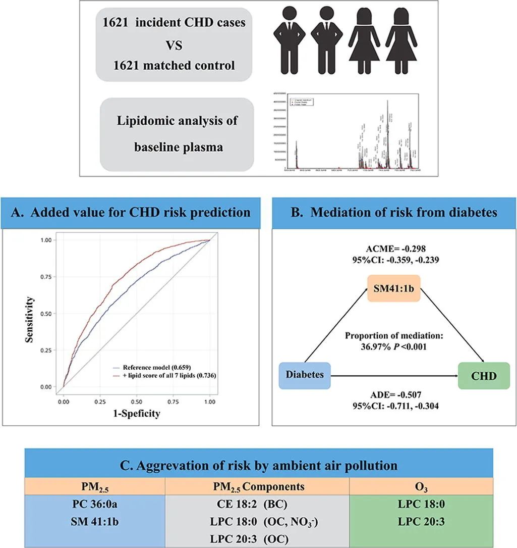 7種脂質的組合可用于CHD的預測因子,從而對初級干預產生指導作用,同時還有潛力作為空氣污染暴露個體中 CHD 風險分層的新生物標志物。