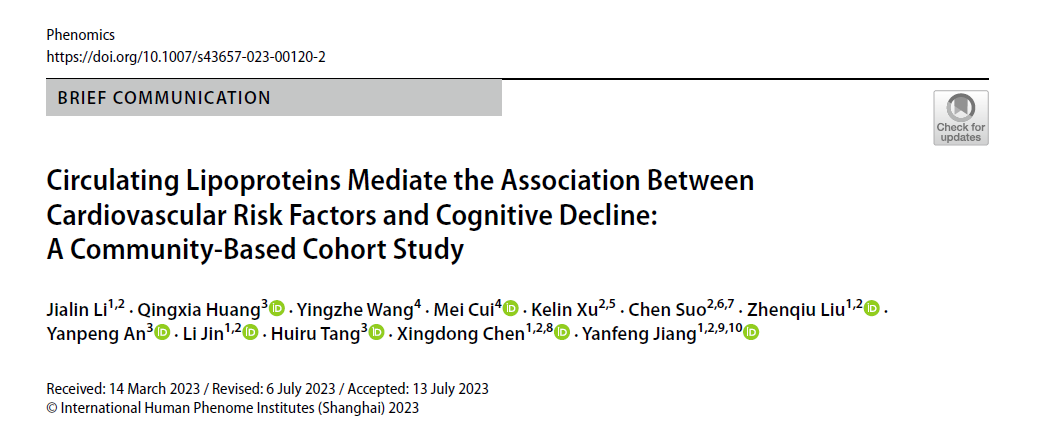 心血管健康指標現在被廣泛認為是認知能力下降和癡呆的可調控的危險因素。心血管疾病和癡呆之間的聯系可能是靠代謝紊亂發揮作用。復旦大學人類表型組研究院蔣艷峰團隊、陳興棟團隊和唐惠儒團隊合作,在前瞻性社區隊列研究中,通過代謝組學進行循環代謝物分析發現心血管危險因素導致認知能力下降的潛在機制。相關成果于2023年7月在Phenomics期刊上發表研究論文,標題是:Circulating Lipoproteins Mediate the Association Between Cardiovascular Risk Factors and Cognitive Decline: A Community-Based Cohort Study,原文鏈接:https://doi.org/10.1007/s43657-023-00120-2。