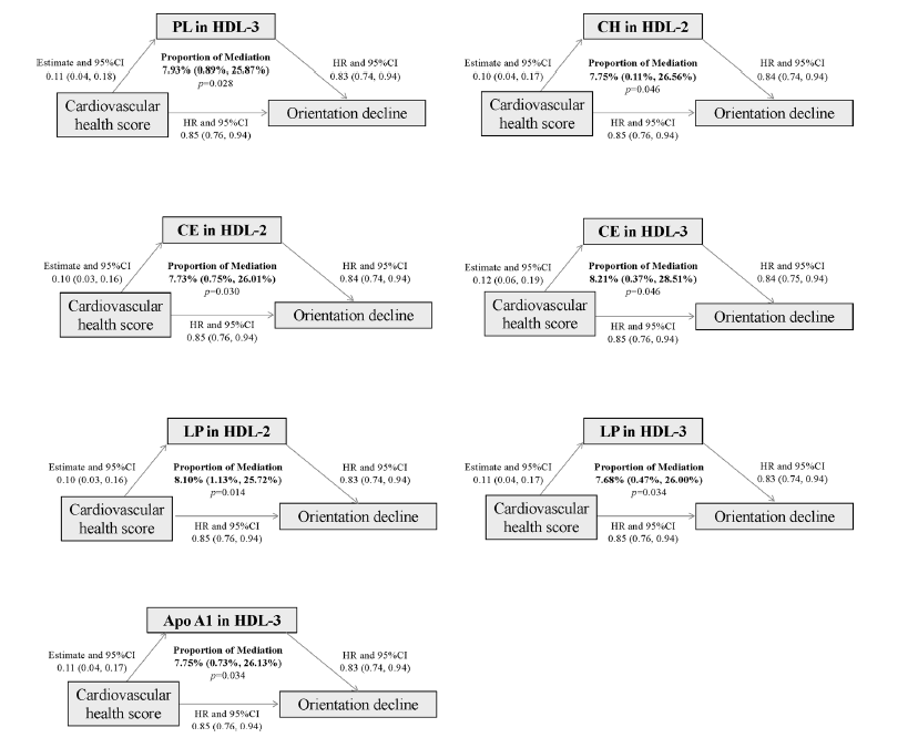 分析發現健康狀況與認知功能下降風險之間的負相關部分是由HDL-2和HDL-3中的膽固醇酯和總脂質介導的(介導比例:7.68-8.21%,均p<0.05)。