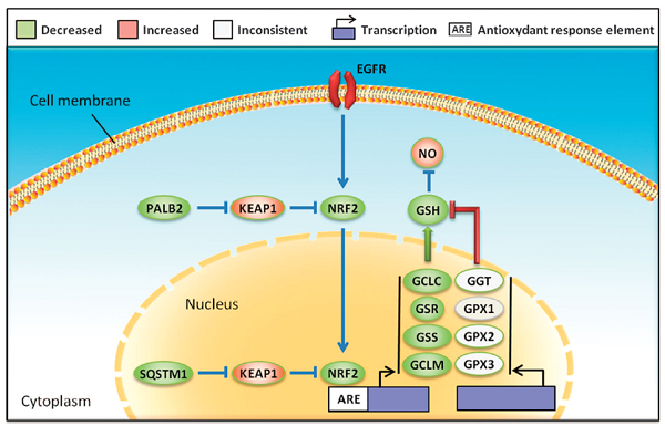 當通過RNA干擾下調erlotinib敏感NSCLC細胞中NRF2或SQSTM1的表達后,GSH合成酶和GSH的水平出現下降,同時癌細胞產生對erlotinib的抗性。相反,當下調erlotinib抗性NSCLC細胞中KEAP1的表達后,癌細胞中GSH水平上升,且對erlotinib的敏感性增強。研究人員發現,兩組NSCLC細胞間的區別很可能是由于SQSTM1在erlotinib抗性細胞中表達量顯著偏低所造成的。