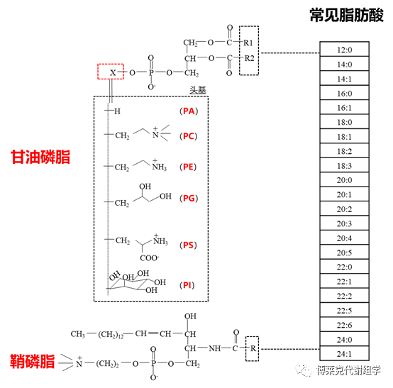 根據組成主要分為甘油磷脂(Glycerophospholipid,GP)和鞘磷脂兩類,鞘磷脂以神經鞘磷脂(Sphingomyelin,SM)為主。甘油磷脂是以甘油為基本骨架,甘油的兩個羥基(sn-1位和sn-2位)被脂肪酸酯化形成非極性;,sn-3位羥基被磷酸酯化為磷脂酸(Phosphatidic acid,PA),磷脂酸的羥基再被膽堿、乙醇胺、絲氨酸或肌醇等取代構成磷脂的極性頭部,從而形成PC,PG,PG,PI和PS等。甘油磷脂在磷脂酶A的作用下水解sn-1位和sn-2位的;溈尚纬梢幌盗械娜苎字↙yso-glycerophospholipid)。鞘磷脂的基本骨架是由鞘氨醇或二羥鞘氨醇的氨基通過酰胺鍵與長鏈脂肪酸結合形成的神經酰胺,神經酰胺的羥基與磷酸膽堿結合形成含鞘氨醇或二氫鞘氨醇的SM。