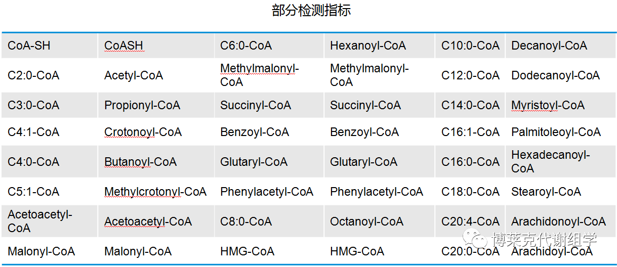 我公司可一針定量測定30+種脂酰CoA,覆蓋C0~C20:5-CoA,包括乙酰CoA、丙酰CoA、丙二酰CoA、琥珀酰CoA等,方法具有用樣量少、靈敏度高、穩定可靠等優點。