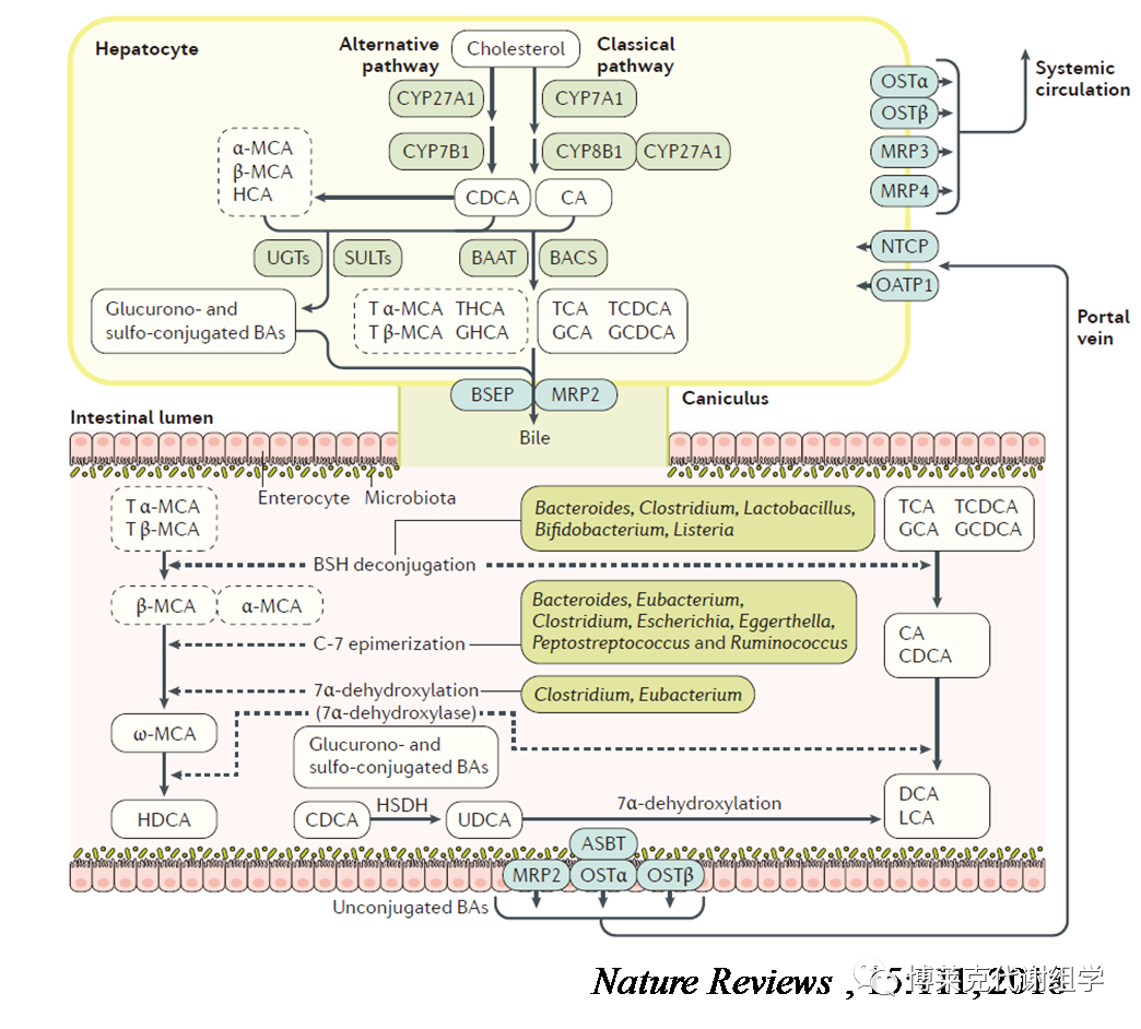 根據來源可分為初級膽汁酸(primary bile acids)和次級膽汁酸(secondary bile acids),前者由肝細胞直接合成,后者是由腸道菌群參與,以及腸肝循環后形成的產物。