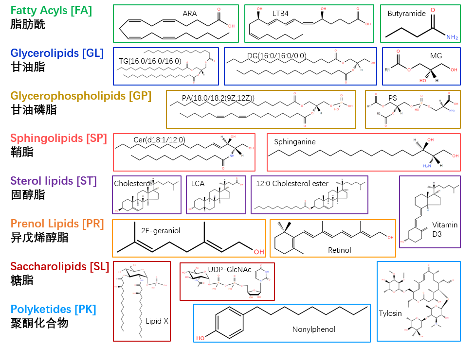脂質(zhì)的分類(lèi)方法多樣,根據(jù)水解產(chǎn)物的復(fù)雜程度,可以將小于等于兩個(gè)水解產(chǎn)物的分為簡(jiǎn)單脂質(zhì),大于三個(gè)或更多的分為復(fù)雜脂質(zhì);根據(jù)疏水性可以分為極性脂質(zhì)和非極性脂質(zhì);根據(jù)功能可以分為膜脂質(zhì)、能量脂質(zhì)和生物活性脂質(zhì)。為了促進(jìn)脂質(zhì)的國(guó)際交流,2005年,脂質(zhì)代謝途徑研究計(jì)劃聯(lián)合會(huì)(LIPID MAPS)建立了一個(gè)開(kāi)放平臺(tái),將脂質(zhì)分為脂肪酰、甘油脂、甘油磷脂、鞘脂、固醇脂、異戊烯醇脂、糖脂和聚酮化合物八大類(lèi)。