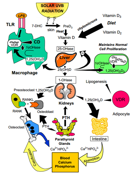 維生素D(Vitamin D, VDs)是一種必需的脂溶性維生素 ,也是固醇激素合成的前體。主要形式為維生素D2(麥角鈣化醇)和維生素D3(膽鈣化醇)及經過兩者代謝合成的一系列衍生物。它在調控體內鈣磷水平和礦化骨骼上有重要作用,而且對骨外系統,包括心血管系統、糖代謝、免疫系統及細胞增殖和分化等發揮重要功能。維生素D可以經日照合成或經魚、蘑菇、肉、蛋、奶等食物補充。它的缺乏會導致佝僂病、骨質疏松并且與糖尿病、心血管疾病等多種疾病相關。